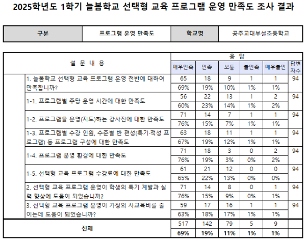 2025학년도 1학기 선택형 교육 프로그램(연계돌봄 포함) 만족도 조사 결과입니다.